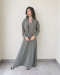 Relaxed maxi dress with a flattering straight cut, paired with a cropped lightweight jacket for an effortless layered look.