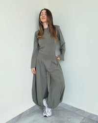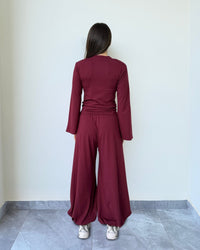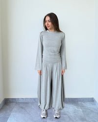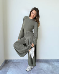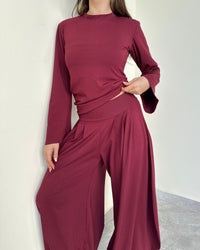 Fit: Fitted top that hugs the body beautifully with structured epaulettes on the shoulders for a strong, elevated look. Flowy wide-leg pants with a flattering high elastic waistband.