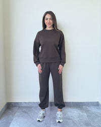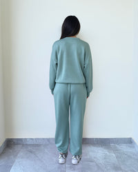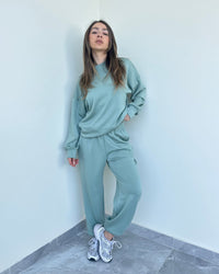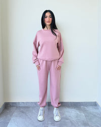Fit: Relaxed oversized sweatshirt with dropped shoulders and elastic cuffs. Paired with straight-cut comfy pants featuring an elastic waistband and elastic at the bottom for a snug fit.