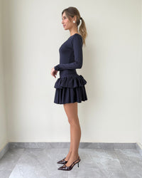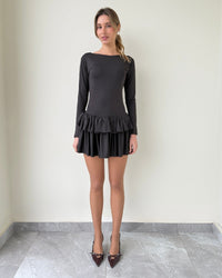 Long-sleeve mini dress with a sleek fitted top and a playful ruffle hem that adds movement and femininity. Flattering silhouette that highlights the waist and legs.