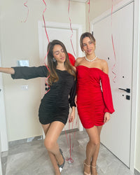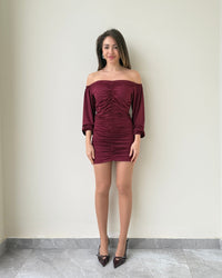 Off-shoulder neckline with elegant long sleeves. Ruched detailing down the front creates a flattering, body-shaping silhouette.