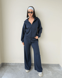 The Luna Set is made from a soft, smooth modal-blend fabric oversized that feels light and gentle on the skin. The hoodie jacket has a relaxed, easy fit, and the wide-leg pants come with a super comfortable elastic waistband that makes the set perfect for all-day wear.