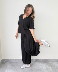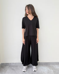 Relaxed oversized fit with a flattering V-neck top and wide-leg flowy pants for that effortless look.
