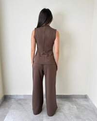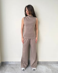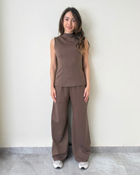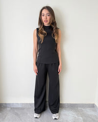 Fitted sleeveless top with a structured, flattering cut, paired with high-waisted wide-leg pants for an elegant and comfortable look.